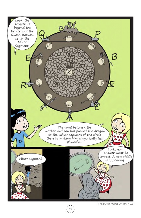 A wise king once ruled a kingdom that was prosperous and well-fortified. Then one day, a powerful Dragon invaded the kingdom and turned the entire army and the citizens to stone, while imprisoning the king in a circular cage. Does Ganitha know all the theorems about circle to help the Angel release the entourage? Buy now and enjoy this theorem packed story happening in a circular arena!